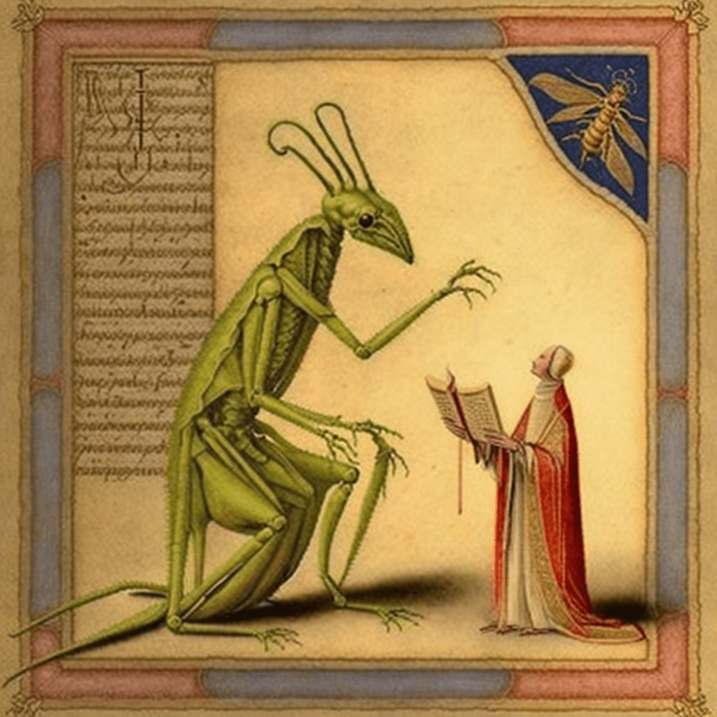Le premier document qui me mit la puce à l’oreille était un fragment de livre datant du moyen âge sur lequel on pouvait voir un évêque qui semblait s’entretenir avec une créature ressemblant à une mante religieuse géante. Au début, évidemment, je le considérai comme faux et je réalisai une authentification en bonne et due forme. Je refis mes analyses quatre fois pour être sûr du résultat. Le parchemin était d’époque.